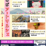 10月の出展は、クラフトテープが織りなすカバンや数々の実用雑貨の編み編みクラブさん、イラストとスエードを融合した丁寧な革小物のはじめの二歩さん、老練な手で作られる雪駄・巾着等の猫の手工房さん、小さなガラスアクセサリ・小物のAtelier Hironさん、あのおやつ探偵がおやつネコで遂に完結する小説の風楽法師さん、信州産の山栗等が並びます。ココロおどるモノ、手にするとワクワクするモノ、美味しいモノ、あったら嬉しいを探しに来てください。 11月以降の出展者も募集中です。