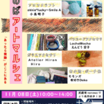 11月の出展は、アロマクラフトとハンドマッサージのakkie*lucky~Smile Aromaさん、クラフトテープが織りなすカバンや数々の実用雑貨の編み編みクラブさん、カラフルなキーホルダやブレスレットがエマージェンシーグッズにもなるパラコードアクセサリのLachaWachaさん、外出が楽しくなるバッグ・ポーチ・小物が嬉しいモモンガさん、小さなガラスアクセサリ・小物のAtelier Hironさん、等が並びます。