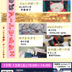 12月の出展は、クラフトテープが織りなすカバンや数々の実用雑貨の編み編みクラブさん、ポップで朗らかなイラストとスエードが魅力的なポートのはじめの二歩さん、ニャンドゥティとマクラメの融合アクセサリが楽しいヤマゲンさん、外出が楽しくなるバッグ・ポーチ・小物が嬉しいモモンガさん、着物生地が華麗な小物に変身の布の子堂さん、等が並びます。